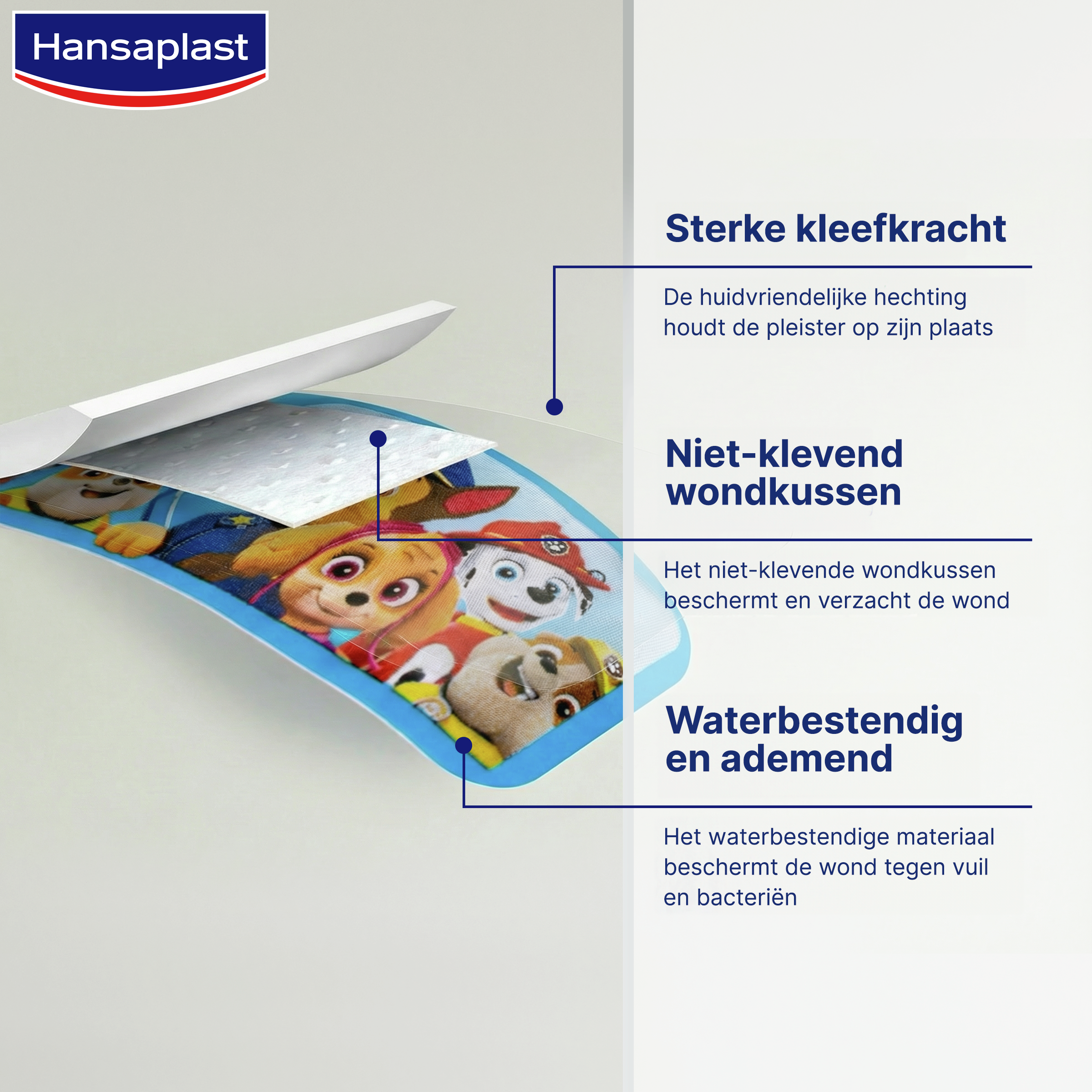 Hansaplast Paw Patrol Pleisters. Huidvriendelijke wondbescherming voor de gevoelige kinderhuid. De kleurrijke Paw Patrol pleisters van Hansaplast helpen de kleintjes snel op te vrolijken na een klein ongelukje en zorgen ervoor dat ze in een mum van tijd weer plezier kunnen hebben. De niet-klevende wondpleisters bieden betrouwbare bescherming voor allerlei soorten schrammen, snijwonden en schaafwonden. Dankzij de verschillende maten en het flexibele materiaal zijn de pleisters geschikt voor kleine, alledaagse wondjes en begeleiden ze kleine avonturiers op hun missie. Bovendien zorgt de sterke kleefkracht ervoor dat de pleister niet verschuift, maar toch pijnloos verwijderd kan worden. De voordelen van het product: