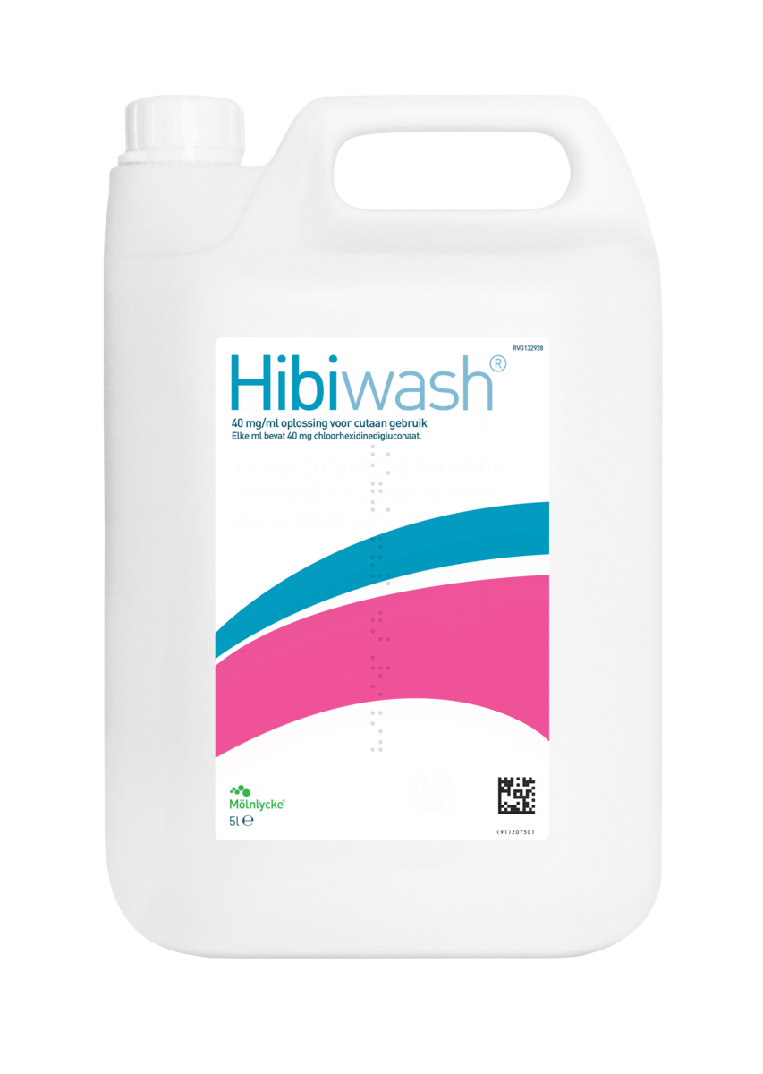Reiniging van de huid in situaties die hoofdzakelijk bacterieel zijn of waar superinfectie waarschijnlijk is. Bevochtig het betreffende gebied, breng 5 ml Hibiwash aan en was gedurende één minuut. Zorgvuldig afspoelen en drogen.