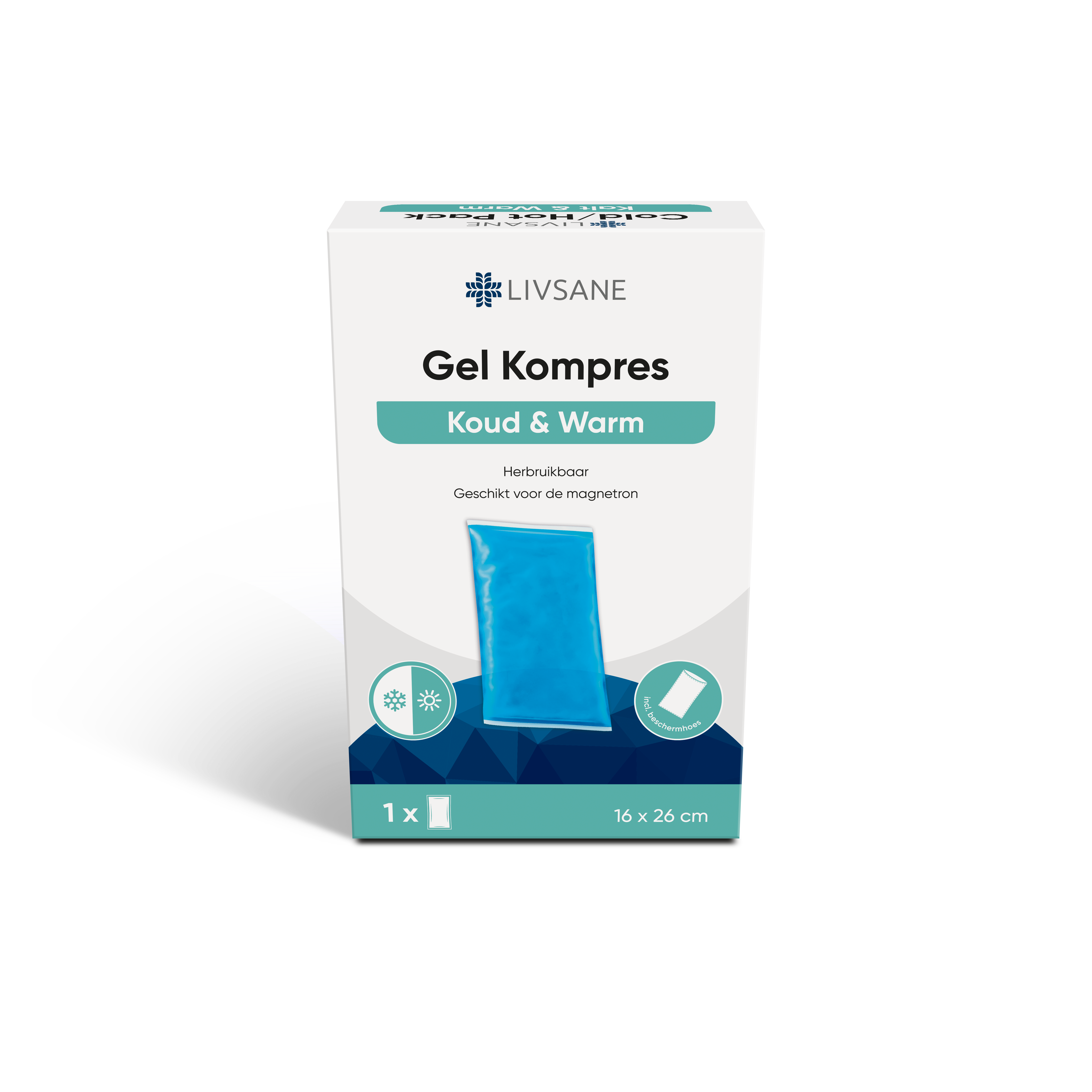 LIVSANE Gel Kompres Koud/Warm 16x26CM bestaande uit een gel kompres en een beschermende hoes. Het kompres is herbruikbaar en kan worden verwarmd in de magnetron of gekoeld in de koelkast en vriezer. Hierdoor is het breed inzetbaar bij pijn, zwelling, spierklachten en sportblessures. Dit medisch hulpmiddel is geschikt voor koude en warme behandeling en is daarmee veelzijdig toe te passen.