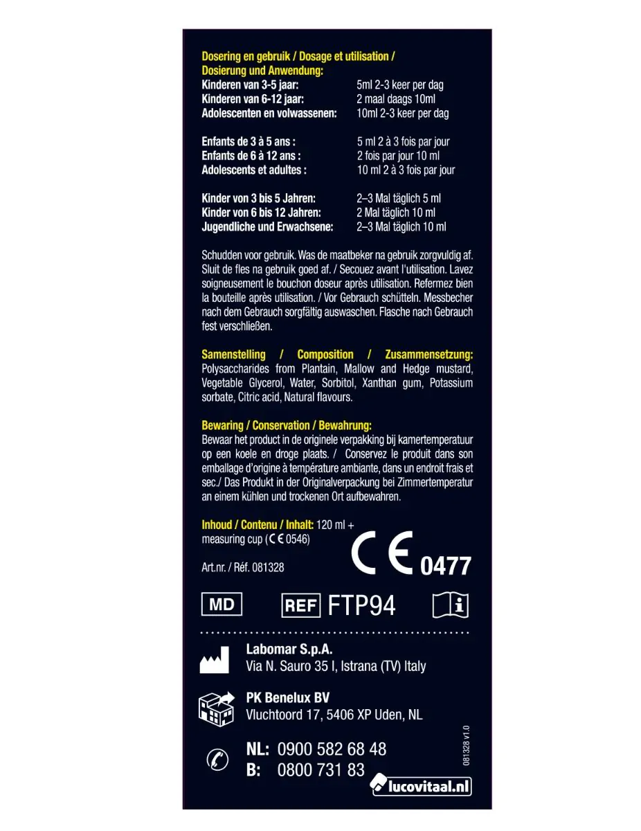 Lucovitaal Hoestsiroop met Weegbree is een medisch hulpmiddel voor de behandeling van elk type hoest: slijmerig, droog, irriterend en/of allergisch. Dankzij de effectieve werking van gecombineerde polysachariden in de formule, legt Lucovitaal Hoestsiroop een aanhoudende,  beschermende en verzachtende laag in de keel.