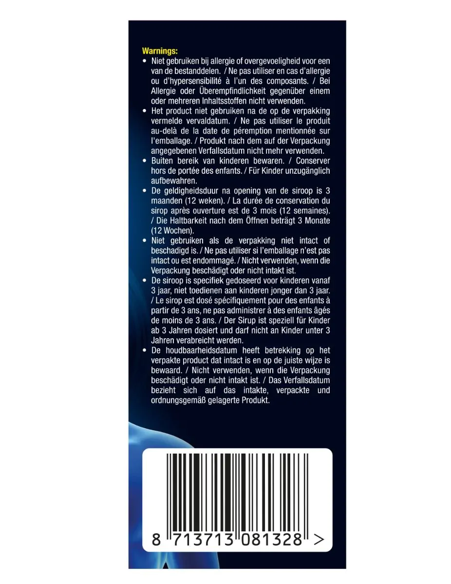 Niet gebruiken bij allergie of overgevoeligheid voor een van de Bestanddelen. Het product niet gebruiken na de op de verpakking vermelde vervaldatum. De geldigheidsduur na opening van de siroop is 3 maanden (12 weken). Niet gebruiken als de verpakking niet intact of beschadigd is. De siroop is specifiek gedoseerd voor kinderen vanaf 3 jaar, niet toedienen aan kinderen jonger dan 3 jaar. De houdbaarheidsdatum heeft betrekking op het verpakte product dat intact is en op de juiste wijze is bewaard. Indien u na een korte behandelperiode (7 dagen) geen resultaat merkt, neem dan contact op met uw arts. In ieder geval niet langer dan 15 dagen gebruiken. Tot nu toe zijn er van dit product geen bijwerkingen waargenomen als gevolg van toediening. Als u echter het optreden van bijwerkingen opmerkt, stel dan uw arts of apotheker hiervan op de hoogte.