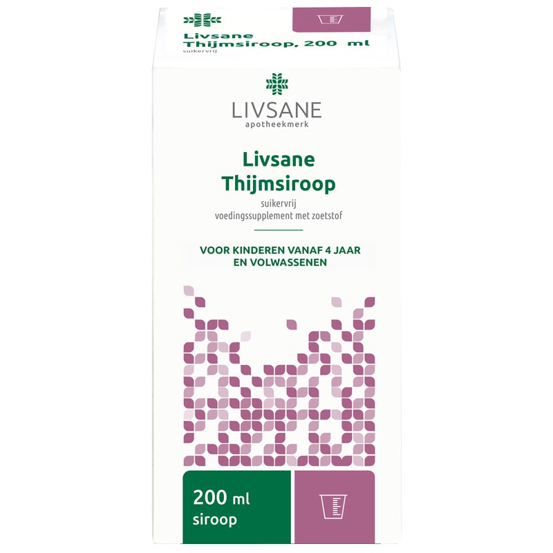 LIVSANE Thijmsiroop suikervrij. Voor kinderen vanaf 4 jaar en voor volwassenen.