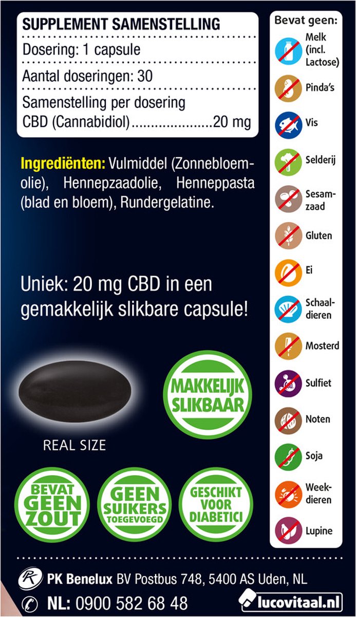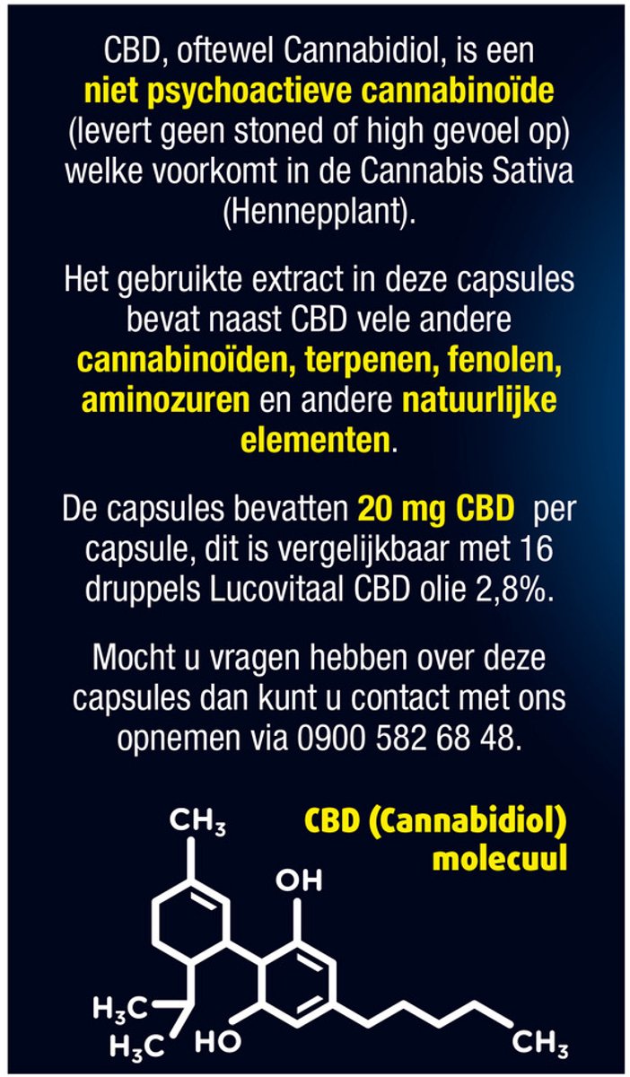 Deze CBD Cannabidiol capsules van Lucovitaal® bevatten 20 mg 100% pure CBD.