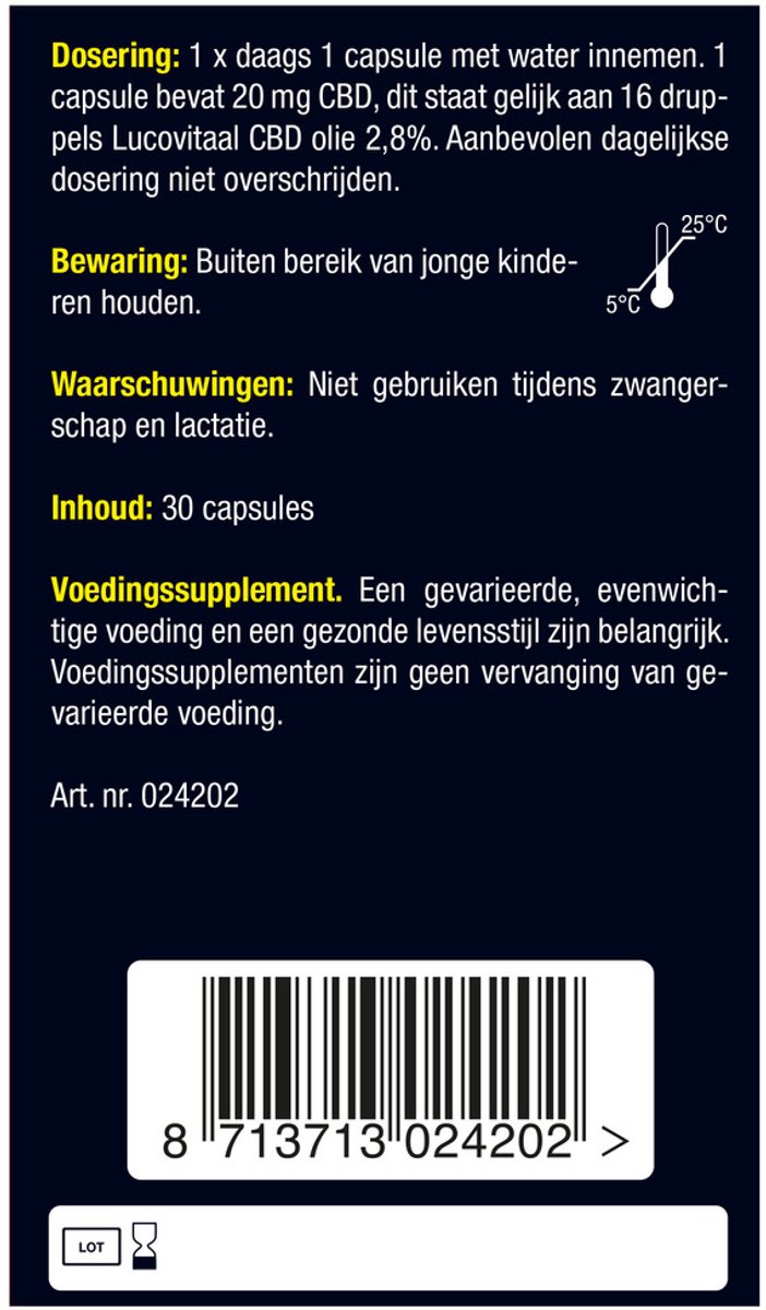 De CBD 20 mg capsules zijn gemakkelijk in gebruik. Ze zijn door het kleine formaat van 1,4 cm gemakkelijk door te slikken. Ga je een dagje weg of op vakantie, dan zijn de capsules makkelijk mee te nemen. Daarbij zijn ze door de softgel capsule smaakloos en dus ideaal voor mensen die moeite hebben met de sterke smaak van CBD olie. Wij raden aan om de 1-per-dag capsules met voldoende water in te nemen. 1 capsule bevat 20 mg CBD, dit staat gelijk aan 16 druppels Lucovitaal CBD olie 2,8%. Eenmaal daags 1 capsule met ruim water innemen. Aanbevolen dagelijkse dosering niet overschrijden.