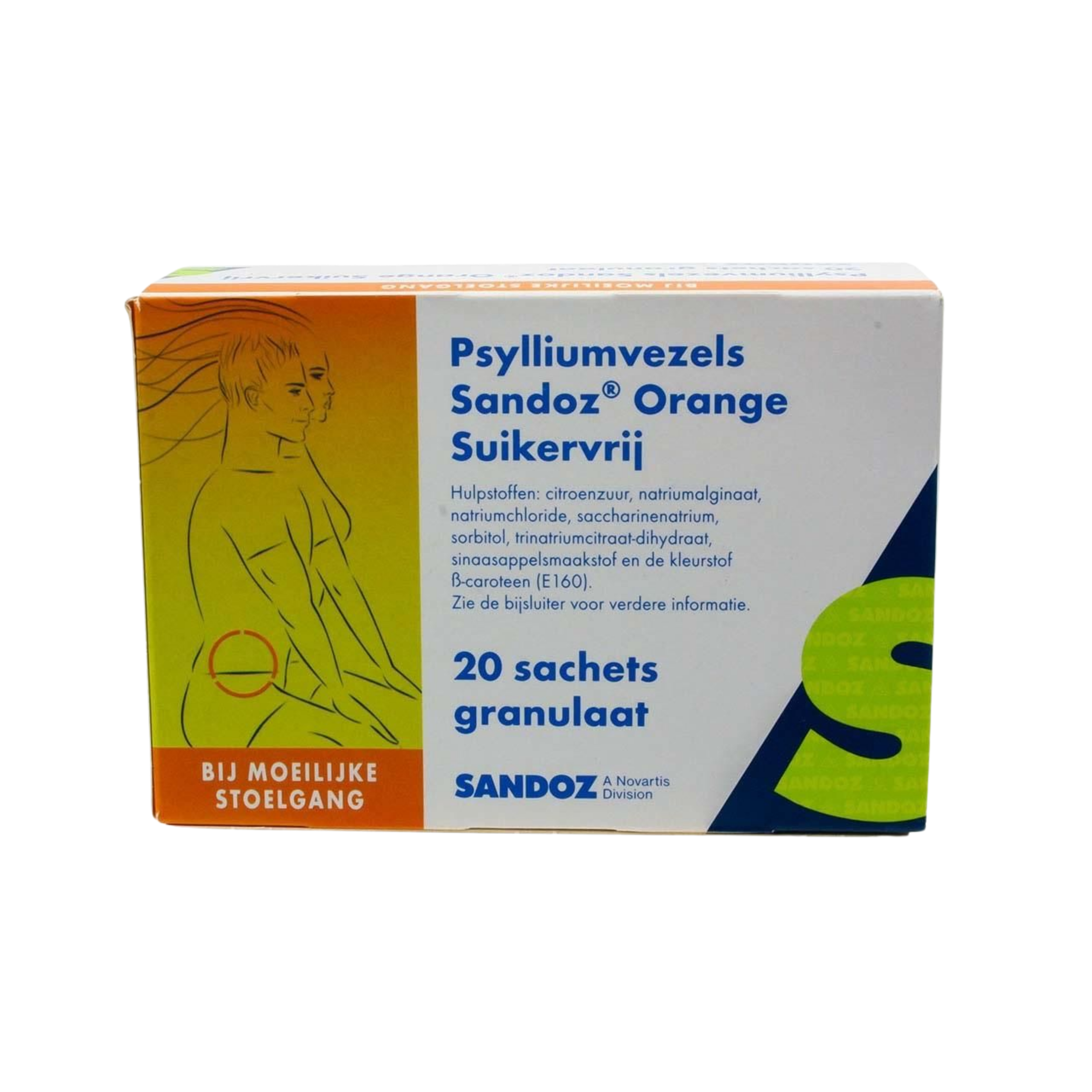 Psylliumvezels Sandoz Orange Suikervrij bevat per sachet 3,25 gram psylliumvezels. Dit zijn gedroogde, fijngemalen, gegranuleerde vezels van de plant Plantago ovata. Dit medicijn is een preparaat op basis van natuurlijke vezels. Het vermengt zich met de darminhoud en heeft het vermogen om water op te nemen. Dit medicijn zorgt voor een zachte, niet irriterende vulling (bulk) van de darm, waardoor de werking van de darm verbetert. Op deze wijze wordt de stoelgang bevorderd. Dit medicijn wordt gebruikt bij langdurige verstopping (obstipatie). Sandoz Psylliumvezels Granulaat is geschikt voor kinderen vanaf 6 jaar. Kinderen van 2 tot 6 jaar mogen dit product uitsluitend op advies van een arts gebruiken.
