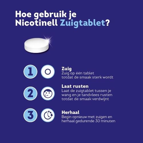 Zuig op de tablet totdat de smaak van nicotine sterk wordt. Laat de tablet tussen je wang en je tandvlees rusten, totdat de smaak verdwijnt. Begin opnieuw met zuigen wanneer de smaak verdwijnt.Herhaal dit gedurende 30 minuten, totdat de tablet volledig is opgelost.