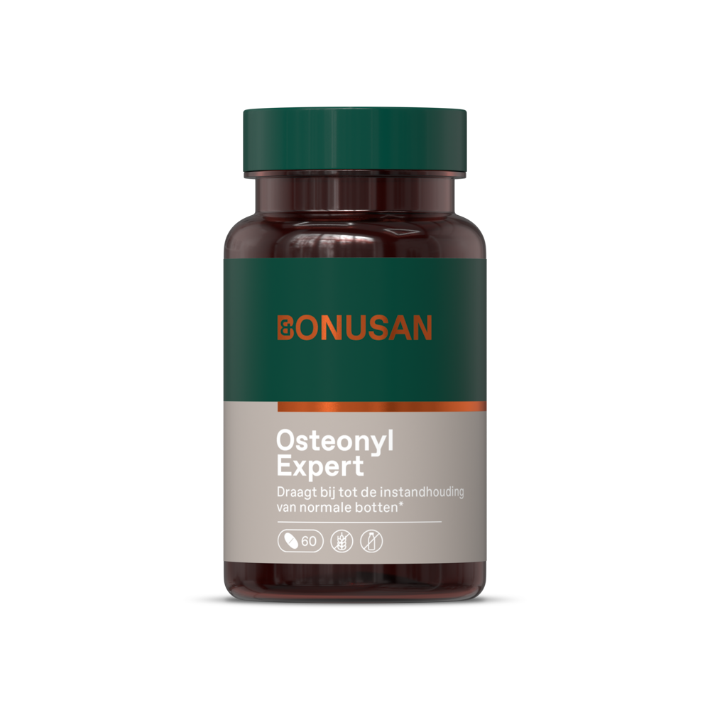 Bonusan Osteonyl Expert is onze meest geavanceerde formule die bijdraagt tot de instandhouding van normale botten. De dosering van 450 mg calcium en 15 mcg vitamine D3 helpt zelfs het verlies van botmineralen bij vrouwen (50+) in de menopauze te verminderen. Een lage botmineraaldichtheid is een risicofactor voor botbreuken door osteoporose*. Bevat per 2 tabletten: Vitamine B1 (als thiaminehydrochloride) 3 mg RI 273% Vitamine B2 (als riboflavine) 3 mg RI 214% Actief vitamine B6 (als pyridoxaal-5'-fosfaat) 1,40 mg RI 100% Vitamine C (als calciumascorbaat) 40 mg RI 50% Vitamine D3 (als cholecalciferol) (600 IE) 15 mcg RI 300% Natuurlijke vitamine E (als D-alfa-tocoferylwaterstofsuccinaat) (18 IE) 15 mg - aTE RI 125% Vitamine K2 (als menaquinon-7, K2VITAL®) 40 mcg RI 53% Calcium (als calciumascorbaat en calciumcarbonaat uit Atlantische marine algen (Lithothamnium calcareum), Aquamin®) 450 mg RI 56% Magnesium (als magnesiummalaat) 100 mg RI 27% Zink (als zinkcitraat) 14 mg RI 140% IJzer (als ijzerbisglycinaat) 7 mg RI 50% Koper (als koperbisglycinaat) 0,60 mg RI 60% Mangaan (als mangaancitraat) 0,60 mg RI 30% Borium (als natriumboraat) 1,10 mg Bamboe tabashir extract (Bambusa arundinacea), gestandaardiseerd op minimaal 75% silica 10 mg Chondroïtinesulfaat 90% (rund) 60 mg L-Arginine (als L-Arginine HCl) 150 mg