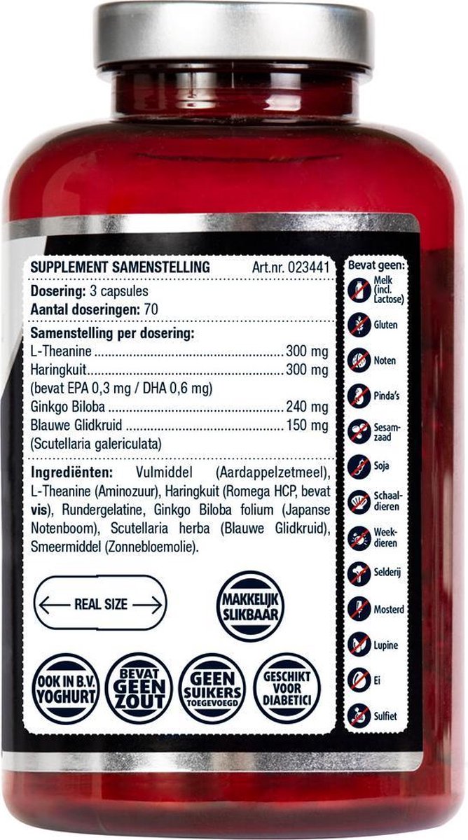 De 4 ingrediënten in dit product zijn L-Theanine, Haringkuit, Ginkgo Biloba en Blauwe Glidkruid (Scutellaria galericulata).