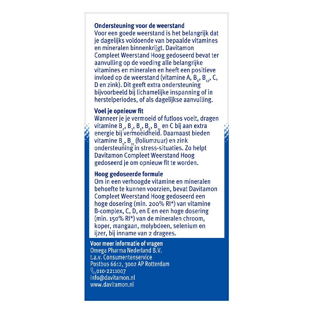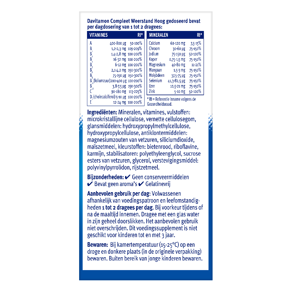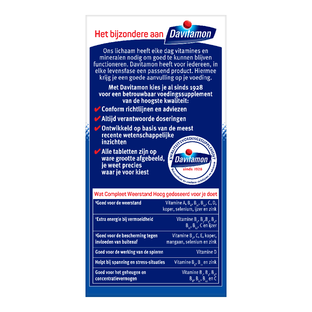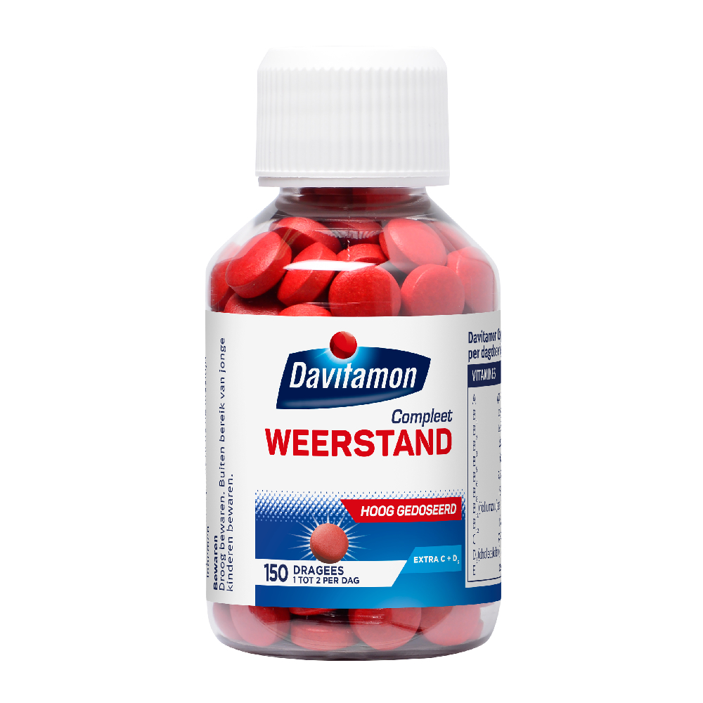 Ondersteuning voor de weerstand. Voor een goede weerstand is het belangrijk dat je dagelijks voldoende van bepaalde vitamines en mineralen binnenkrijgt. Davitamon Compleet Weerstand Hoog gedoseerd bevat ter aanvulling op de voeding alle belangrijke vitamines en mineralen en heeft een positieve invloed op de weerstand (Vitamine A,B6,B12,C,D en zink). Dit geeft extra ondersteuning bijvoorbeeld bij lichamelijke inspanning of in herstelperiodes, of als dagelijkse aanvulling.