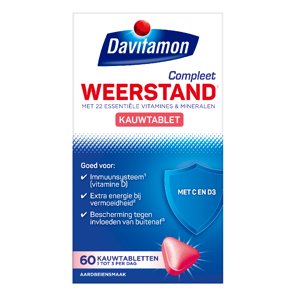 DAVITAMON COMPLEET WEERSTAND KAUWVITAMINES AARDBEI is speciaal ontwikkeld voor volwassenen en bevat een combinatie van vitamines en mineralen. De tabletten hebben hierdoor een unieke werking. Zo zijn ze: