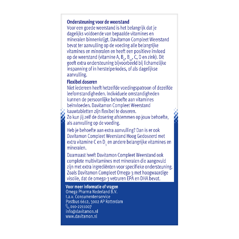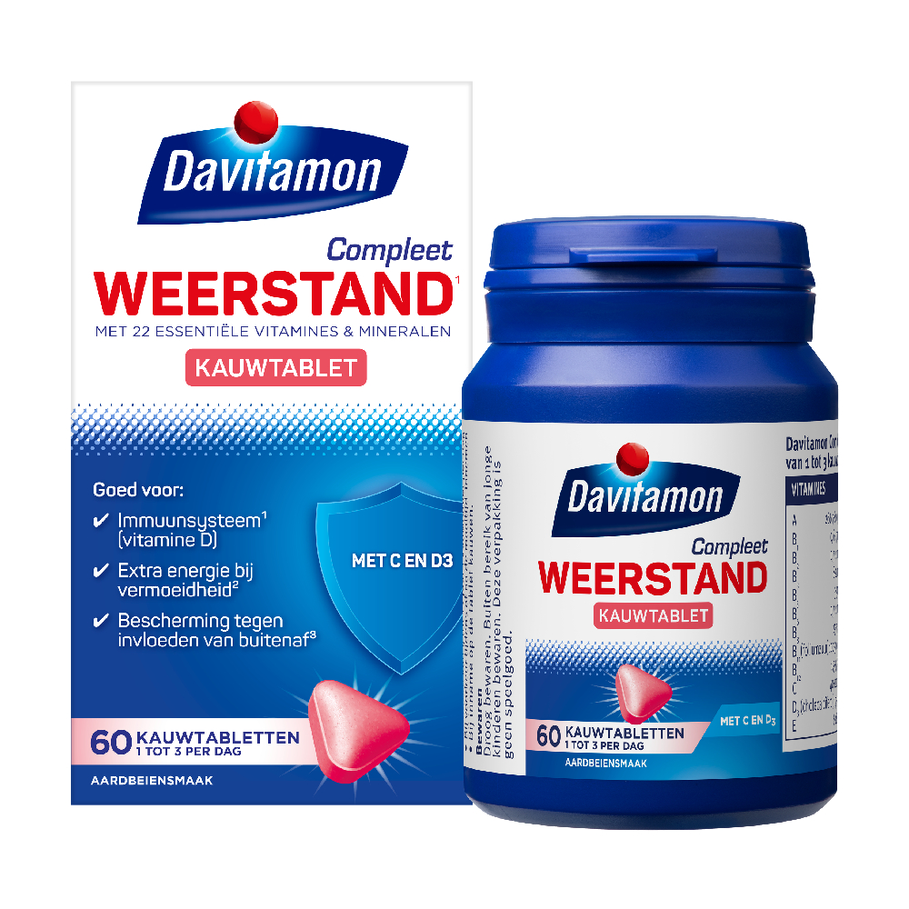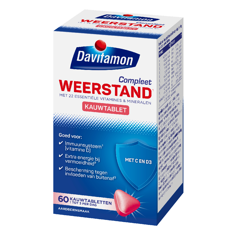 Je lichaam heeft dagelijks vitamines en mineralen nodig om goed te blijven functioneren en een goede gezondheid in stand te houden. Gezond en gevarieerd eten is de basis om voldoende vitamines en mineralen binnen te krijgen. Maar soms kan aanvulling in de vorm van een voedingssupplement, zoals Davitamon Compleet Weerstand KauwVitamines raadzaam zijn.