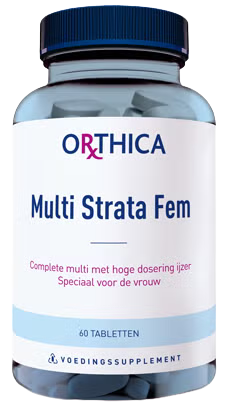 Orthica Multi Strata Fem is een compleet vrouwensupplement dat afgestemd is op de nutritionele behoeften van vrouwen vanaf 18 jaar, van de menstruatie tot en met de overgang. De formule bevat een hoge dosering ijzer, wat bijdraagt aan de normale vorming van rode bloedcellen en hemoglobine, en vitamine B2, B3, B5 en B6, die helpen vermoeidheid en moeheid te verminderen. Daarnaast bevat Multi Strata Fem tweemaal de aanbevolen dagelijkse hoeveelheid vitamine D en foliumzuur, en is het product verrijkt met zink, selenium, biotine en koper, die bijdragen aan normaal haar, normale nagels en een gezonde huid. Vitamine C ondersteunt bovendien de collageenvorming die nodig is voor een normale huid. De formule is verder aangevuld met druivenpitextract en groene thee‑extract, die rijk zijn aan natuurlijke polyfenolen en catechinen. Multi Strata Fem is vrij van gist, sacharose en synthetische conserveermiddelen en is geschikt als dagelijkse aanvulling voor vrouwen in verschillende levensfasen.