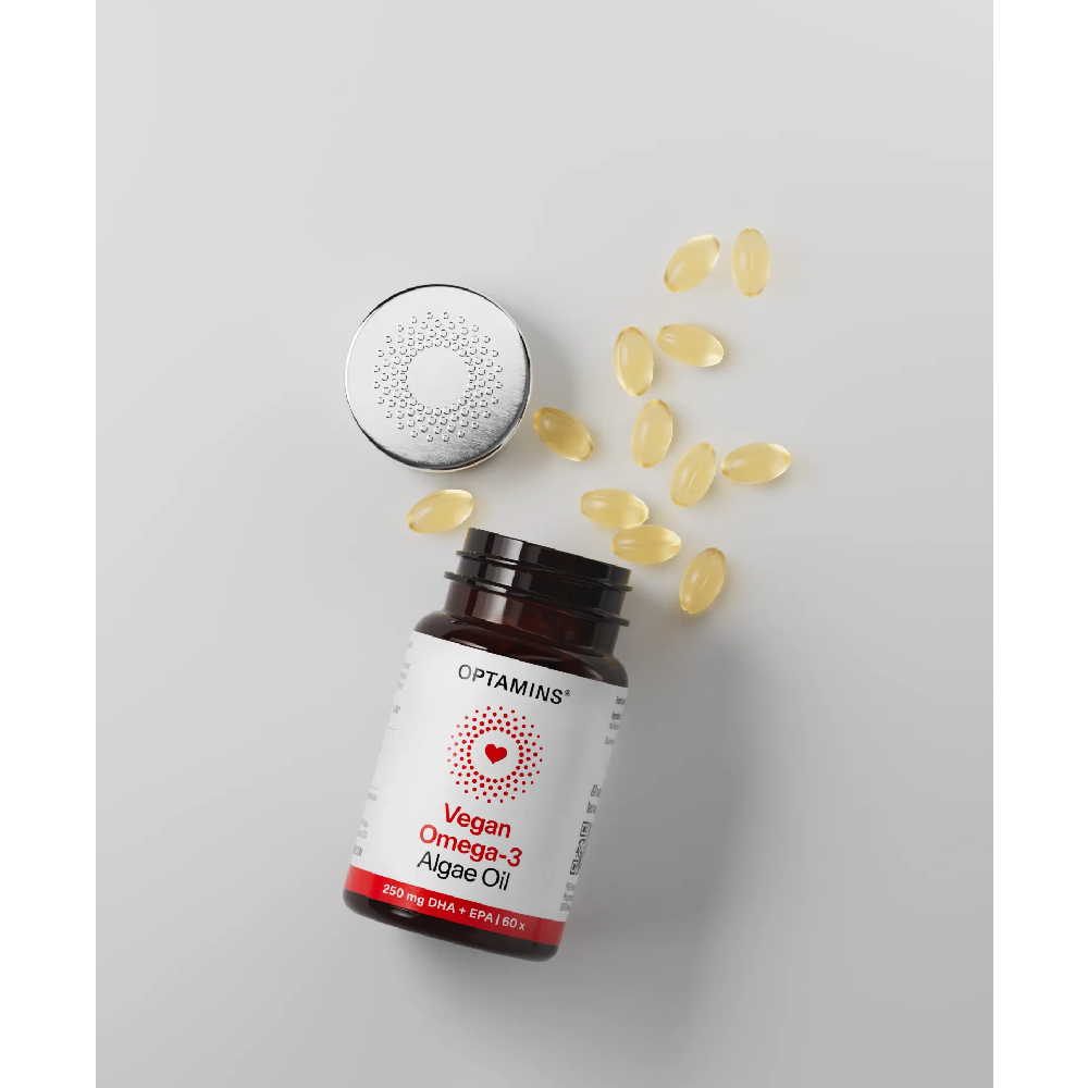 OPTAMINS Vegan Omega-3 Algenolie biedt een plantaardig alternatief voor visolie, met DHA en EPA afkomstig van duurzaam gekweekte microalgen (Schizochytrium sp.). Deze algenolie bevat 250 mg EPA en DHA per capsule, wat bijdraagt aan de normale werking van het hart¹ . Dankzij de plantaardige oorsprong is deze algenolie vrij van de typische nasmaak van visolie.