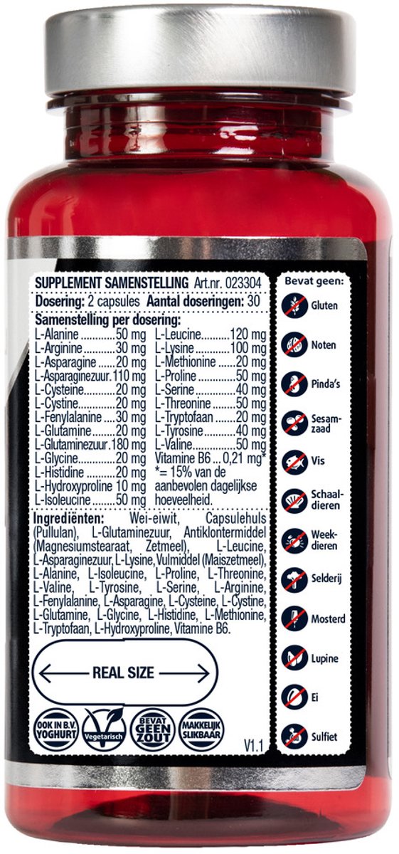 Wei-eiwit (Melk), Capsulehuls (HPMC), Antiklontermiddelen (Magnesiumzouten uit vetzuren, Colloïdaal silicium dioxide), L-Glutaminezuur, L-Leucine, L-Asparagine, L-Hydroxyproline, Vitamine B6.