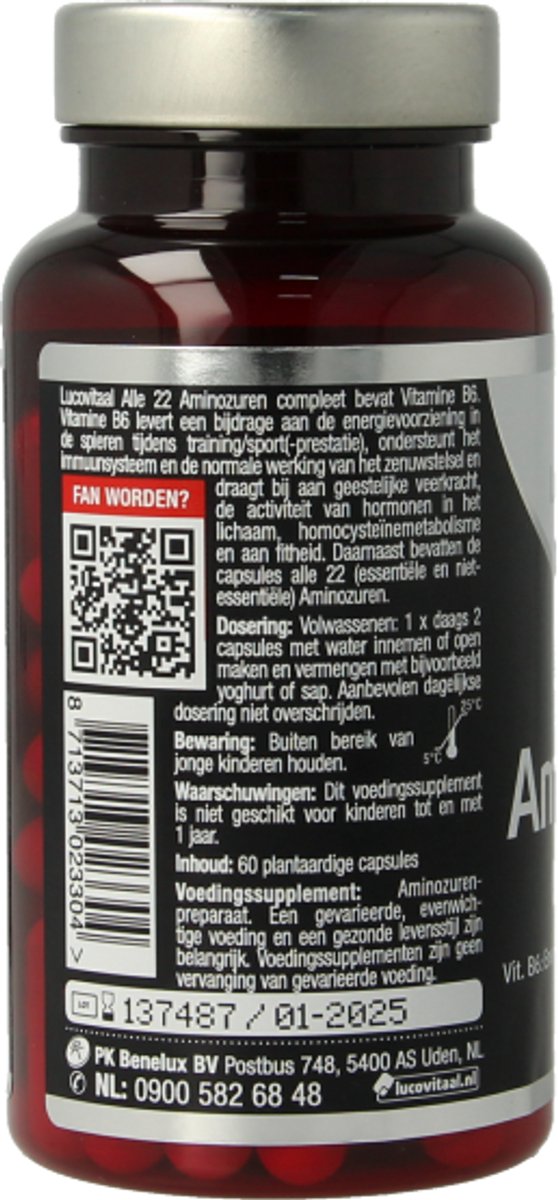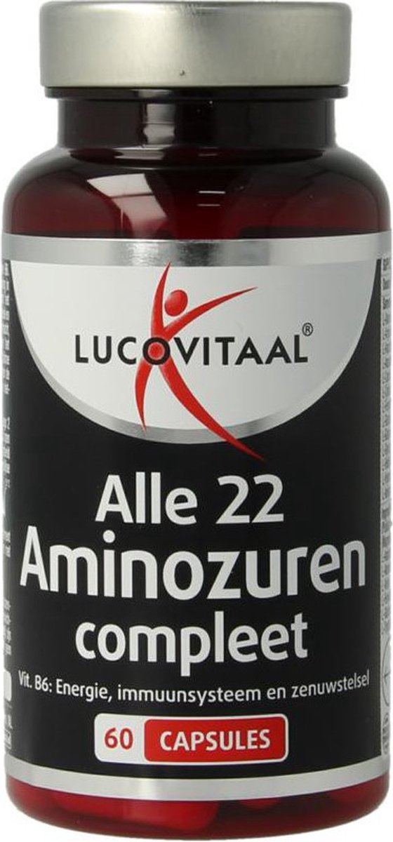 Lucovitaal Alle 22 Aminozuren compleet bevat Vitamine B6. Vitamine B6 levert een bijdrage aan de energievoorziening in de spieren tijdens training/sport(-prestatie), ondersteunt het immuunsysteem en de normale werking van het zenuwstelsel en draagt bij aan geestelijke veerkracht, de activiteit van hormonen in het lichaam, homocysteïnemetabolisme en aan fitheid. Daarnaast bevatten de capsules alle 22 (essentiële en niet-essentiële) Aminozuren. De plantaardige capsules zijn gemakkelijk slikbaar of open te maken en in te nemen met bijvoorbeeld yoghurt.