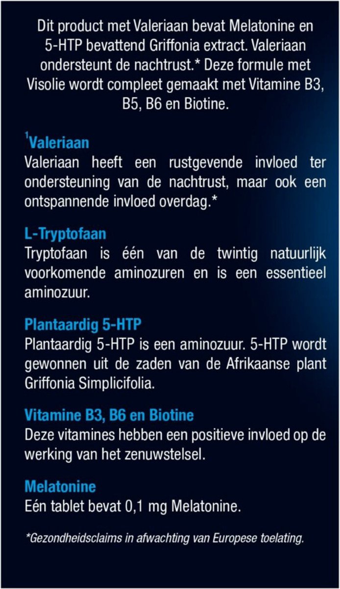 Dit product met Valeriaan bevat Melatonine en 5-HTP bevattend Griffonia extract. Valeriaan ondersteunt de nachtrust.* Deze formule met Visolie wordt compleet gemaakt met Vitamine B3, B5, B6 en Biotine. *Gezondheidsclaims in afwachting van Europese toelating.