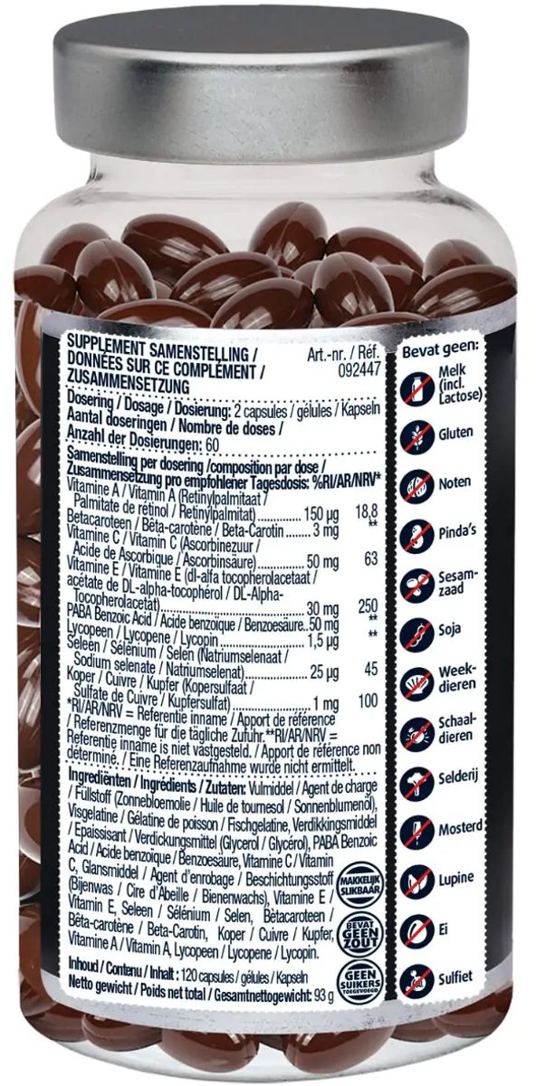 Vulmiddel (Zonnebloemolie), Visgelatine, Verdikkingsmiddel (Glycerol), PABA Benzoic Acid, Vitamine C, Glansmiddel (Bijenwas), Vitamine E, Seleen, Bètacaroteen, Koper, Vitamine A, Lycopeen.