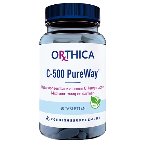 C‑500 PureWay van Orthica bevat per tablet 500 mg vitamine C als PureWay‑C™, een vorm die dankzij inkapseling in lipide metabolieten beter opneembaar en mild voor maag en darmen is. Vitamine C ondersteunt de normale werking van het immuunsysteem en draagt bij aan de bescherming van gezonde lichaamscellen als antioxidant. Daarnaast helpt vitamine C bij het verminderen van vermoeidheid en moeheid en ondersteunt het energie‑stofwisselingsprocessen door bij te dragen aan de vrijmaking van energie uit vetten, koolhydraten en eiwitten. Vitamine C draagt ook bij aan een normale collageenvorming, wat belangrijk is voor de huid, en bevordert de opname van ijzer uit de voeding. Dit supplement is geschikt voor volwassenen en jongeren vanaf 12 jaar als aanvulling op een gevarieerd, evenwichtig voedingspatroon en gezonde leefstijl. De aanbevolen dosering is 1 tablet per dag, bij voorkeur tijdens of na een maaltijd; de maximale dosering is 2 tabletten per dag. Overschrijd de aanbevolen dagelijkse hoeveelheid niet. C‑500 PureWay is geschikt voor vegetariërs en veganisten en bevat geen gist, synthetische conserveermiddelen of kunstmatige kleur‑, geur‑ of smaakstoffen. Bewaar het product droog, afgesloten en buiten bereik van jonge kinderen. Een voedingssupplement vervangt geen gevarieerde voeding.