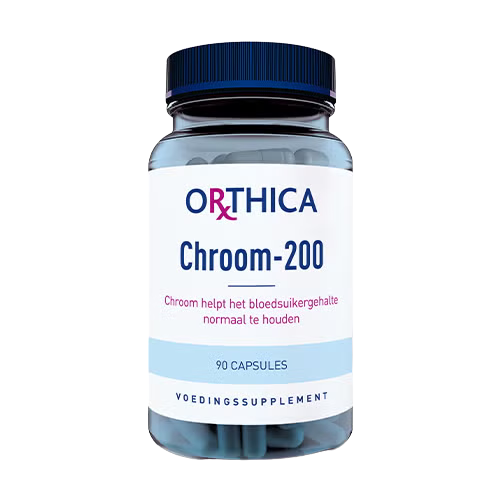 Orthica Chroom‑200 is een hooggedoseerd chroomsupplement dat 200 microgram chroompicolinaat per capsule bevat, een organisch gebonden vorm van chroom die goed opneembaar is voor het lichaam. Chroom speelt een rol bij het behoud van een normale bloedsuikerspiegel doordat het bijdraagt aan een normale glucosestofwisseling. Het mineraal chroom komt van nature in kleine hoeveelheden voor in voeding zoals vlees, granen, noten en vis, maar de inname kan variëren. Chroom‑200 biedt een eenvoudige manier om de dagelijkse chroominname aan te vullen wanneer dit wenselijk is. Het product bevat geen gist, sacharose of synthetische conserveringsmiddelen of kleur‑, geur‑ en smaakstoffen. De capsules zijn verpakt in een lichtgewicht potje en geschikt voor dagelijks gebruik als onderdeel van een gezonde leefstijl en gevarieerd voedingspatroon.