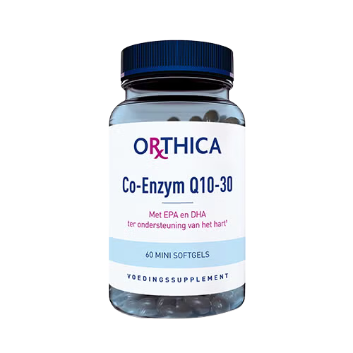 Orthica Co‑enzym Q10‑30 combineert 30 mg Q10 met 450 mg visolie met EPA en DHA, ter ondersteuning van een normale werking van het hart.