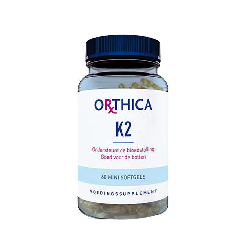 Orthica K2 bevat vitamine K2 (menaquinon‑7), een vorm van vitamine K die een belangrijke rol speelt in het behoud van sterke botten en een normale bloedstolling. Hoewel de darmflora in beperkte mate vitamine K2 aanmaakt, kan bij sommige mensen aanvullende inname wenselijk zijn. Vitamine K2 draagt bij aan de samenstelling van de botten en ondersteunt een normaal bloedstollingsproces. Het supplement wordt geleverd in kleine, gemakkelijk te slikken mini‑softgels en is vrij van gluten, lactose, soja‑eiwit, gist en synthetische conserveermiddelen of kunstmatige kleur-, geur- en smaakstoffen. Gebruik je antistollingsmedicatie (zoals coumarinederivaten), dan wordt geadviseerd om eerst met een arts te overleggen voordat je dit supplement inneemt.