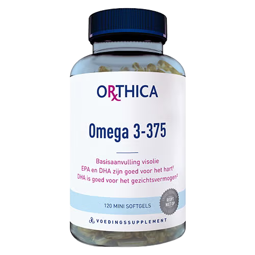 Orthica Omega‑3 375 is een dagelijks visolie­-supplement met 375 mg omega‑3 vetzuren uit gezuiverd visolieconcentraat, bestaande uit de essentiële vetzuren EPA en DHA. Deze vetzuren spelen een belangrijke rol in het lichaam: DHA draagt bij aan een normaal gezichtsvermogen en een normale hersenfunctie, terwijl EPA en DHA samen bijdragen aan het behoud van een normale bloeddruk, normale triglyceridenspiegels en een normale werking van het hart. De mini‑softgels zijn voorzien van een speciale EnteriC enterische coating, waardoor ze pas oplossen in de dunne darm; dit voorkomt oprispen of vissmaak en maakt ze ideaal voor kinderen, ouderen en iedereen die moeite heeft met slikken. Orthica gebruikt gezuiverde visolie van hoge kwaliteit en voldoet aan strenge duurzaamheids‑ en zuiverheidseisen. Omega‑3 375 kan tevens worden gebruikt door zwangere en borstvoedende vrouwen, omdat DHA bijdraagt aan een normale ontwikkeling van hersenen en ogen van het kind.