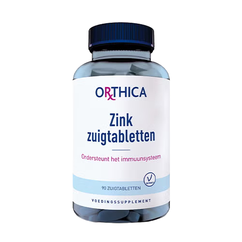 Orthica Zink Zuigtabletten zijn speciaal ontwikkeld voor dagelijkse ondersteuning van het immuunsysteem, met 4 mg zinkcitraat per tablet en toegevoegde vitamine C, dat – net als zink – bijdraagt aan een normale weerstand. De zuigtabletten bevatten daarnaast propolis en worden gezoet met xylitol en zuurvrije vitamine C, waardoor ze vriendelijk zijn voor het gebit. De natuurlijke smaak van honing en citroen maakt ze ideaal voor zowel kinderen als volwassenen. Zink speelt een rol bij tal van lichaamsprocessen: het ondersteunt onder meer het immuunsysteem, het gezichtsvermogen, de hormoonhuishouding, de huid, de celdeling, en de kwaliteit van sperma bij mannen. Vitamine C ondersteunt daarnaast de energiestofwisseling en helpt cellen beschermen tegen oxidatieve stress. Orthica Zink Zuigtabletten zijn geschikt vanaf 4 jaar, vrij van gluten, lactose, soja‑eiwit, gist, sacharose en synthetische kleur‑, geur‑ en smaakstoffen, en zijn goed te combineren met andere weerstandssupplementen van Orthica.