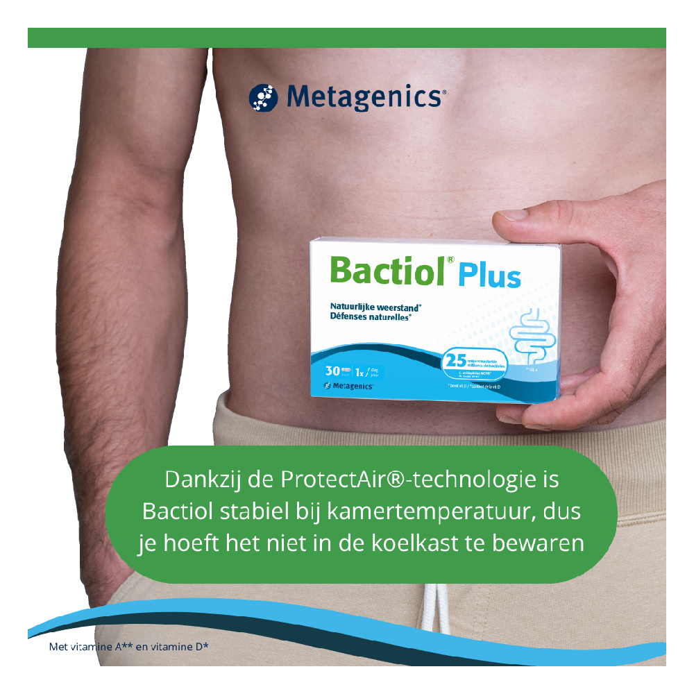 Probactiol plus is stabiel op kamertemperatuur. De exclusieve ProtectAir productietechnologie – speciaal ontwikkeld door Metagenics - garandeert namelijk het aantal levende bacteriën en de kwaliteit ervan tot op het einde van de houdbaarheid.