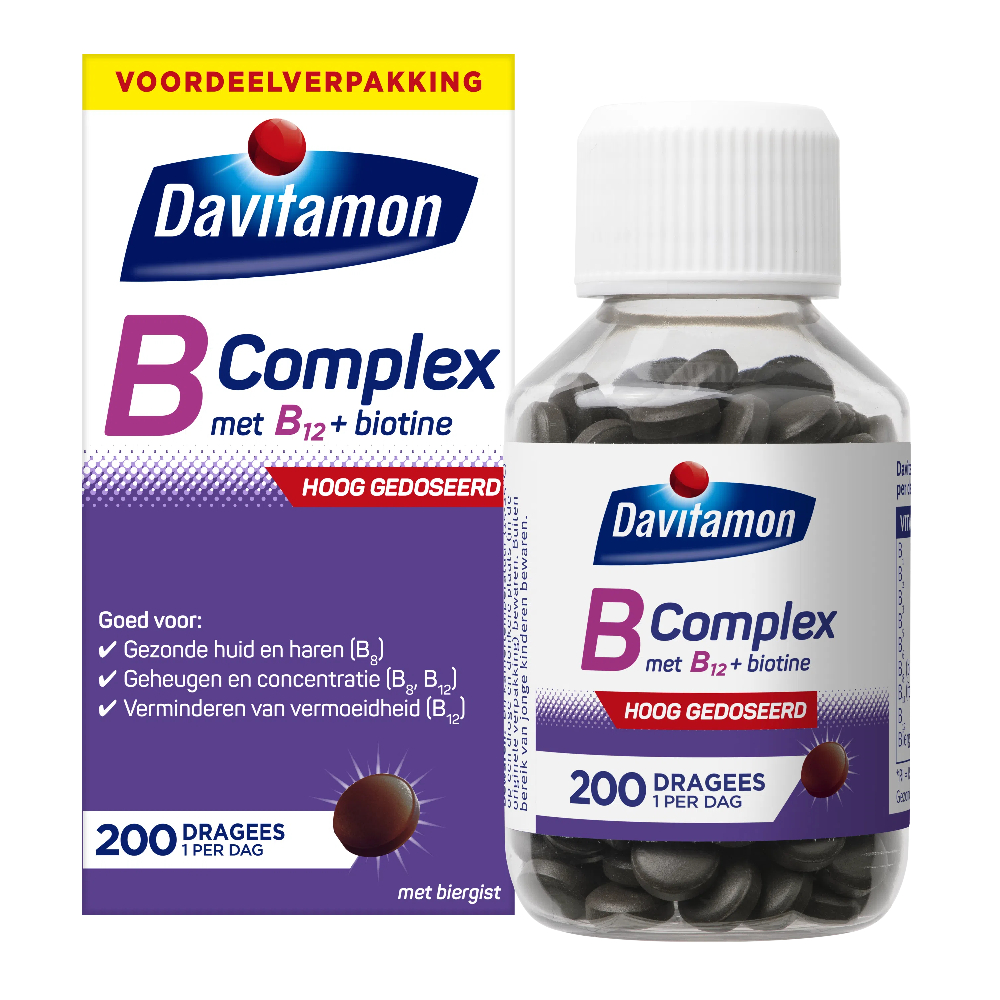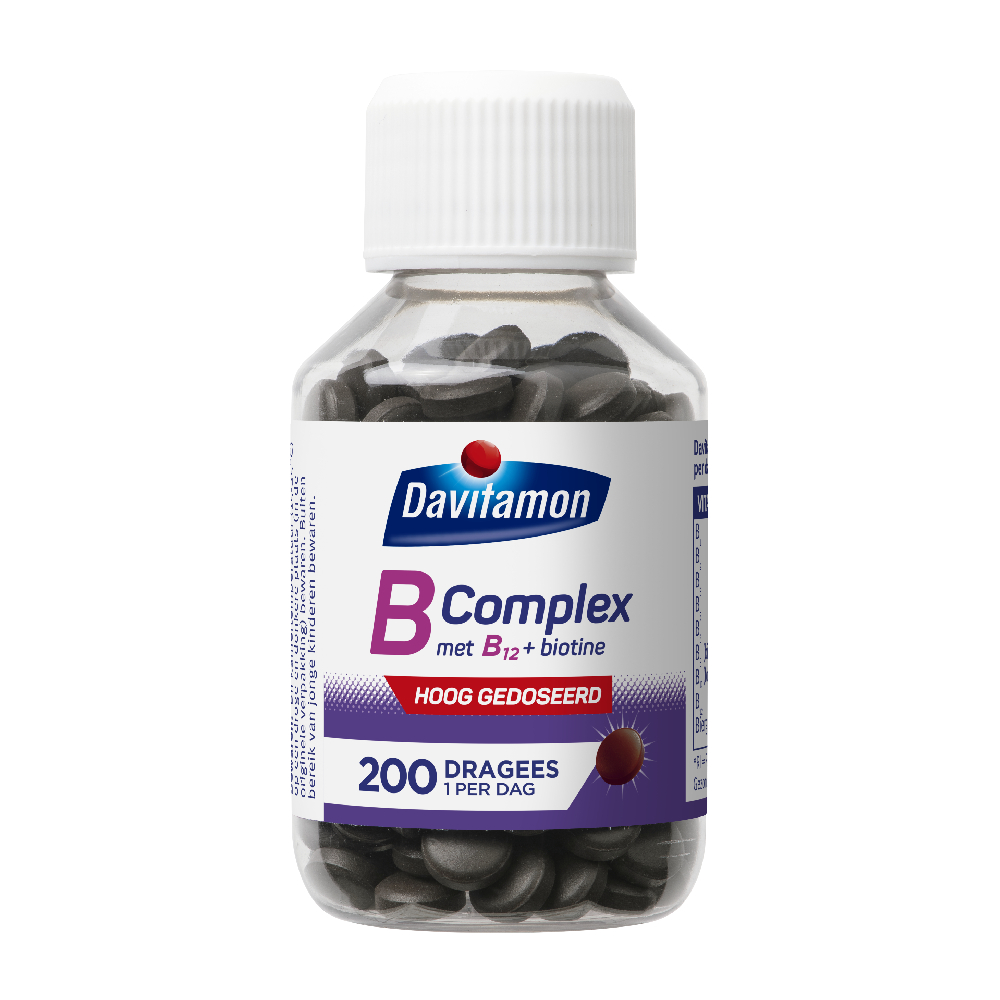 Het bijzondere aan Davitamon B-Complex forte. Davitamon B-Complex forte is een krachtig en compleet vitamine B voedingssupplement met biergist. Biergist (Saccharomyces cerevisiae) is van nature rijk aan een aantal vitamines uit het B-complex. Het vitamine Bcomplex is een verzamelnaam voor acht verschillende B vitamines: B1, B2, B3, B5, B6, B8, B11 en B12. Ze zijn allemaal verenigd in Davitamon B-Complex forte en hebben verschillende functies. Zo helpen de vitamines B2, B3, B5, B6, B11 en B12 bij vermoeidheidsverschijnselen en zijn de vitamines B1, B2, B3, B5, B6, B8, B12 van belang om je energieniveau dagelijks op peil te houden. Vitamine B2, B3 en B8 ondersteunen het behoud van een gezonde huid. En vitamine B8 draagt bij aan een goede conditie van de haren.