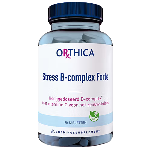 Orthica Stress B‑complex is een compleet B‑vitamine­-supplement met variabel gedoseerde B‑vitamines, waaronder vitamine B5, foliumzuur, B12 en de actieve vorm van vitamine B6. De formule is ontworpen ter ondersteuning van drukke, stressvolle periodes en draagt bij aan een normale werking van het zenuwstelsel en mentale functies zoals concentratie, geheugen en gemoedstoestand. Vitaminen B2, B3, B5, B6, foliumzuur en vitamine B12 helpen bovendien vermoeidheid en moeheid te verminderen, terwijl foliumzuur specifiek bijdraagt aan de weerstand tegen stress. Naast het volledige B‑complex bevat het supplement 75 mg vitamine C, wat de natuurlijke energie in het lichaam activeert en bijdraagt aan een heldere geest. Stress B‑complex is geschikt voor volwassenen en een ideale aanvulling voor iedereen die door werkdruk, een intensief gezinsleven of lichamelijke inspanning extra ondersteuning kan gebruiken.