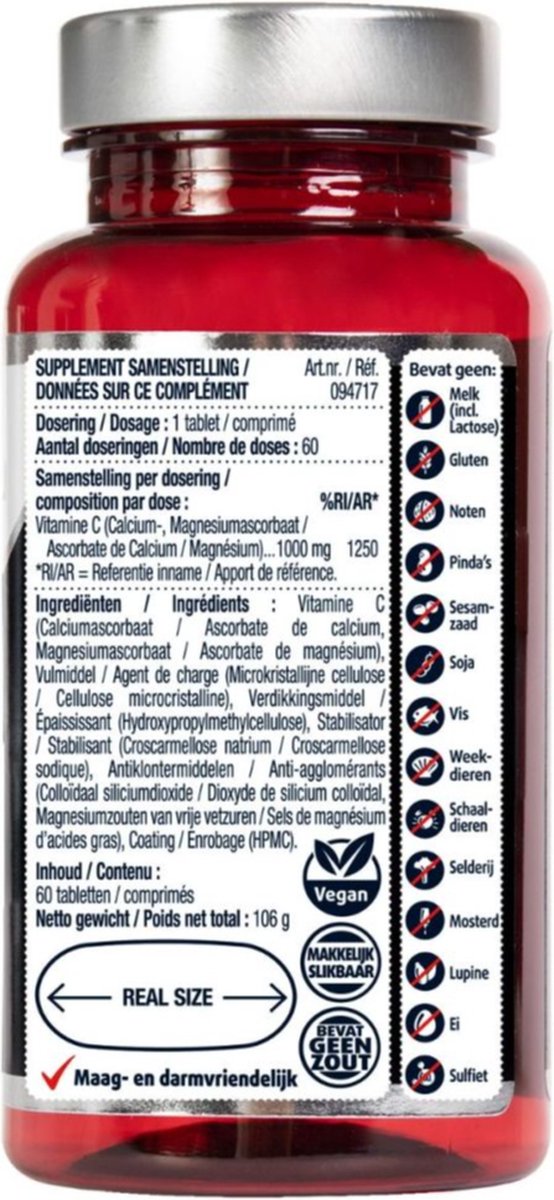Vitamine C (Calciumascorbaat, Magnesiumascorbaat), Vulmiddel (Microkristallijne cellulose), Verdikkingsmiddel (Hydroxypropylmethylcellulose), Stabilisator (Croscarmellose natrium), Antiklontermiddelen (Colloïdaal siliciumdioxide, Magnesiumzouten van vrije vetzuren), Coating (HPMC).