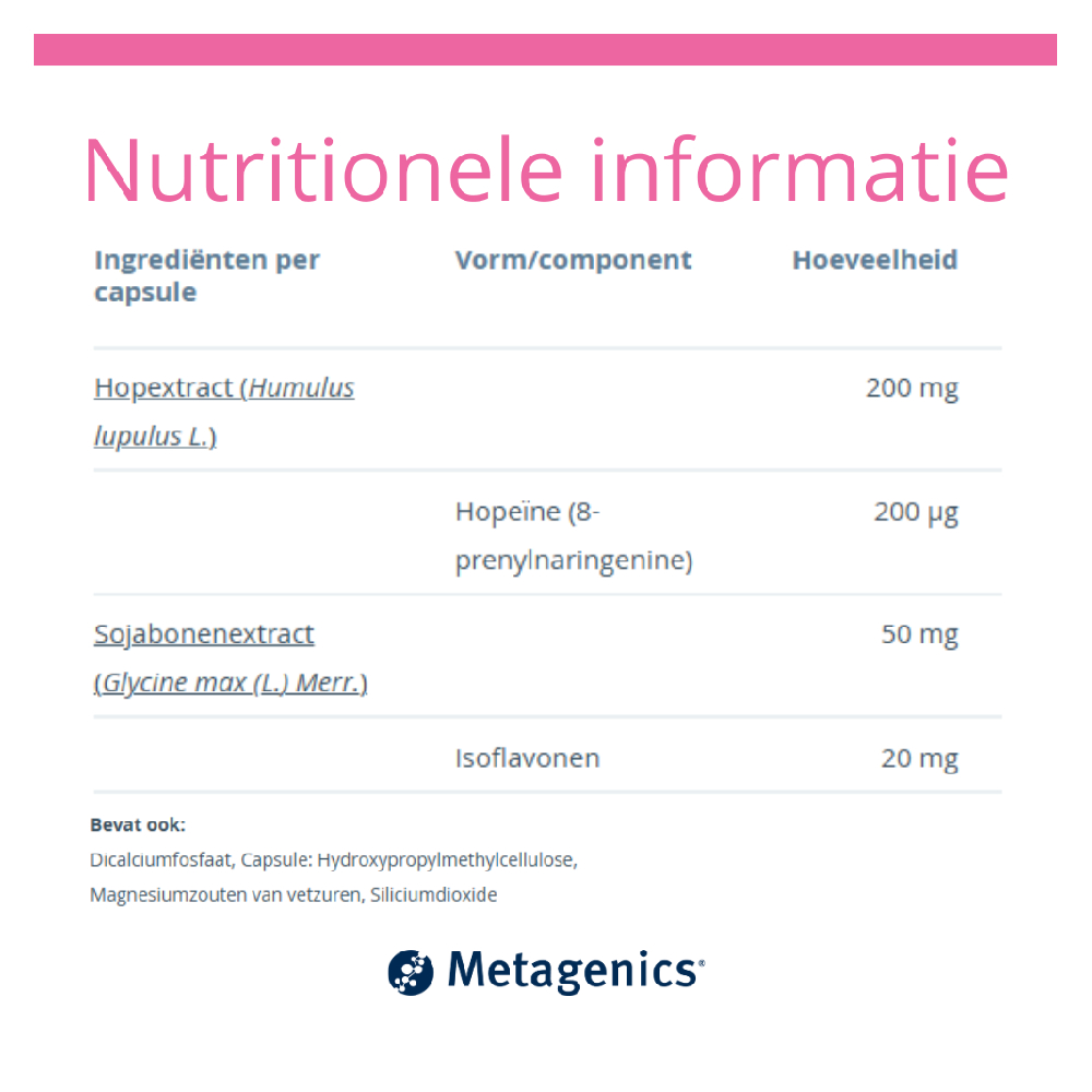 2 krachtige fyto-oestrogenen: hop en soja-isoflavonen Hop: hopeïne of 8-prenylnaringenine: gepatenteerde extractieprocedure Helpt bij het behoud van een kalme en comfortabele menopauze Hopeïne: helpt vrouwen omgaan met korte-termijnklachten zoals warmteopwellingen, prikkelbaarheid en rusteloosheid Synergetische werking van hopeïne en isoflavonen bij het verlichten van de overgangsklachten