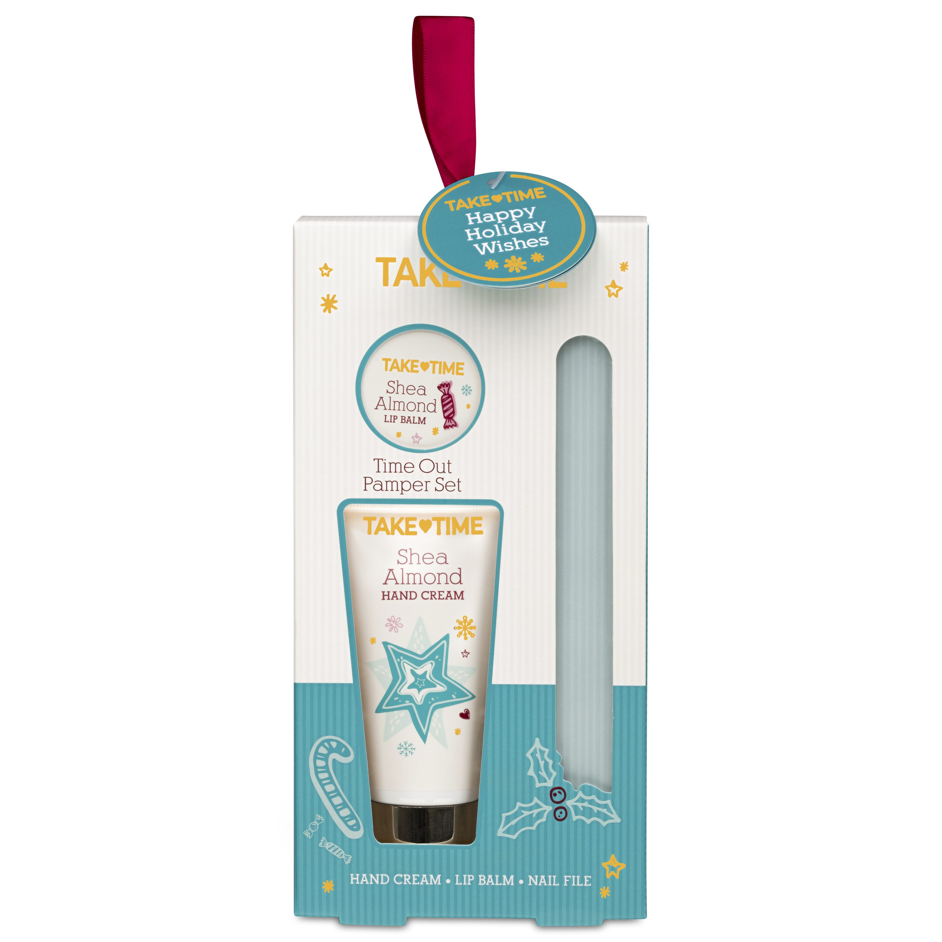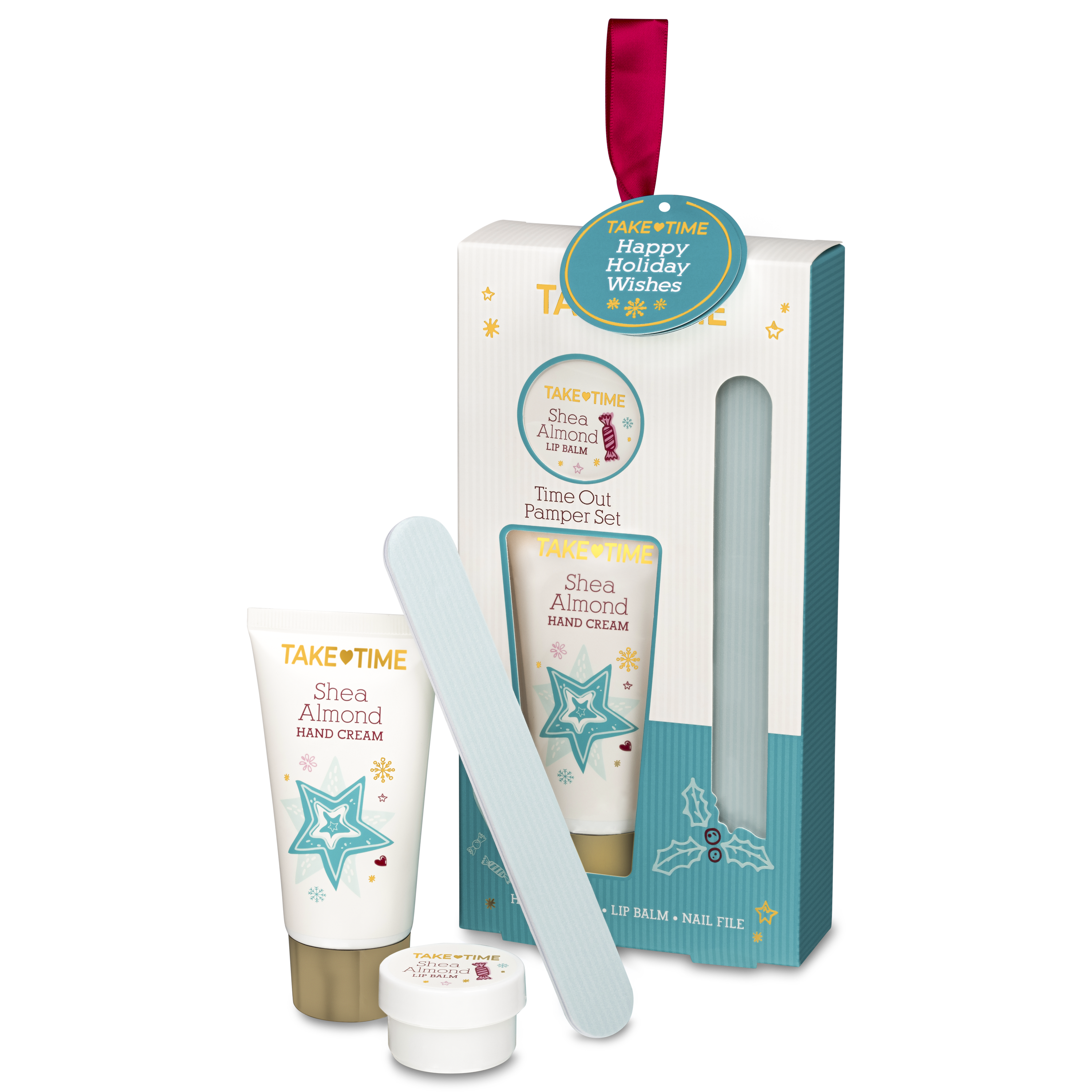 Complete verzorging voor handen en lippen met de TAKE-TIME set. Inclusief handcrème, lippenbalsem en nagelvijl.