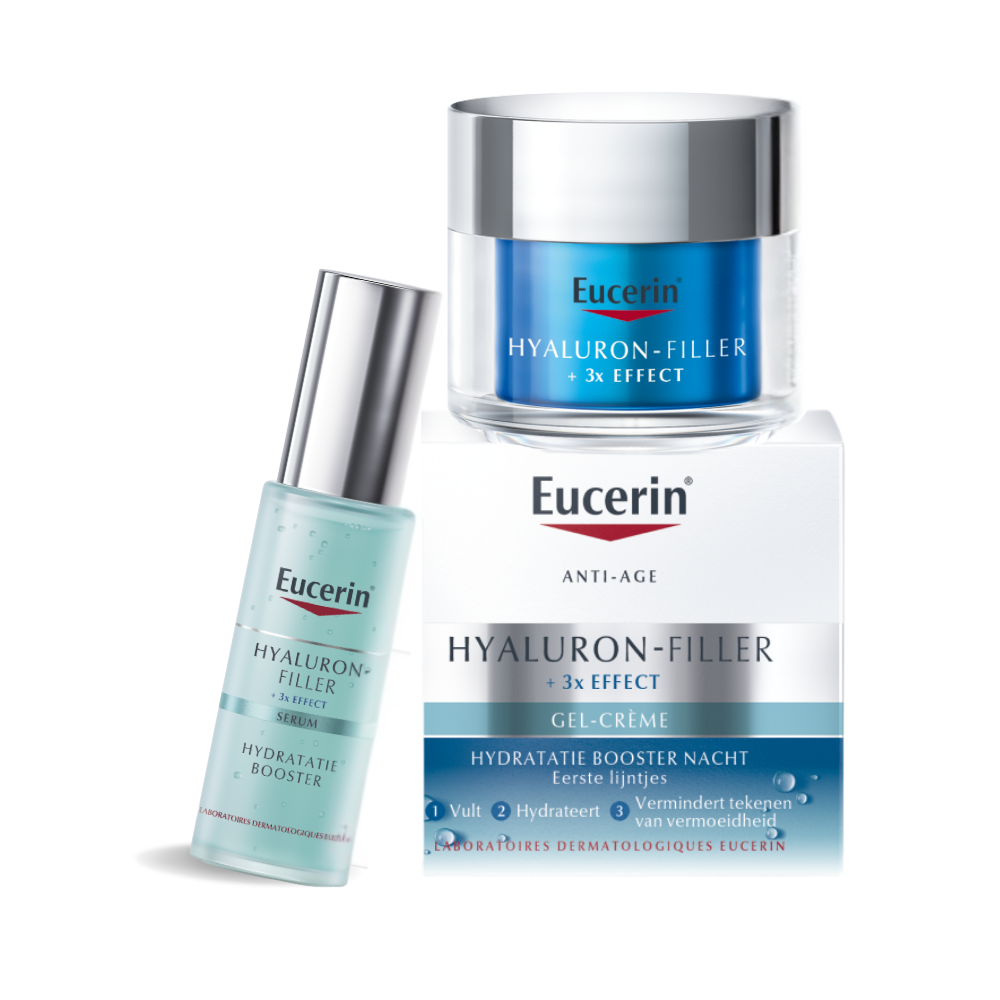 De routine set van Eucerin Hyaluron-filler 3x effect. Met een booster serum en een hydratatie booster nachtcrème. Hyaluron-filler 3x effect is voor de fijne lijntjes en eerste tekenen van huidveroudering.