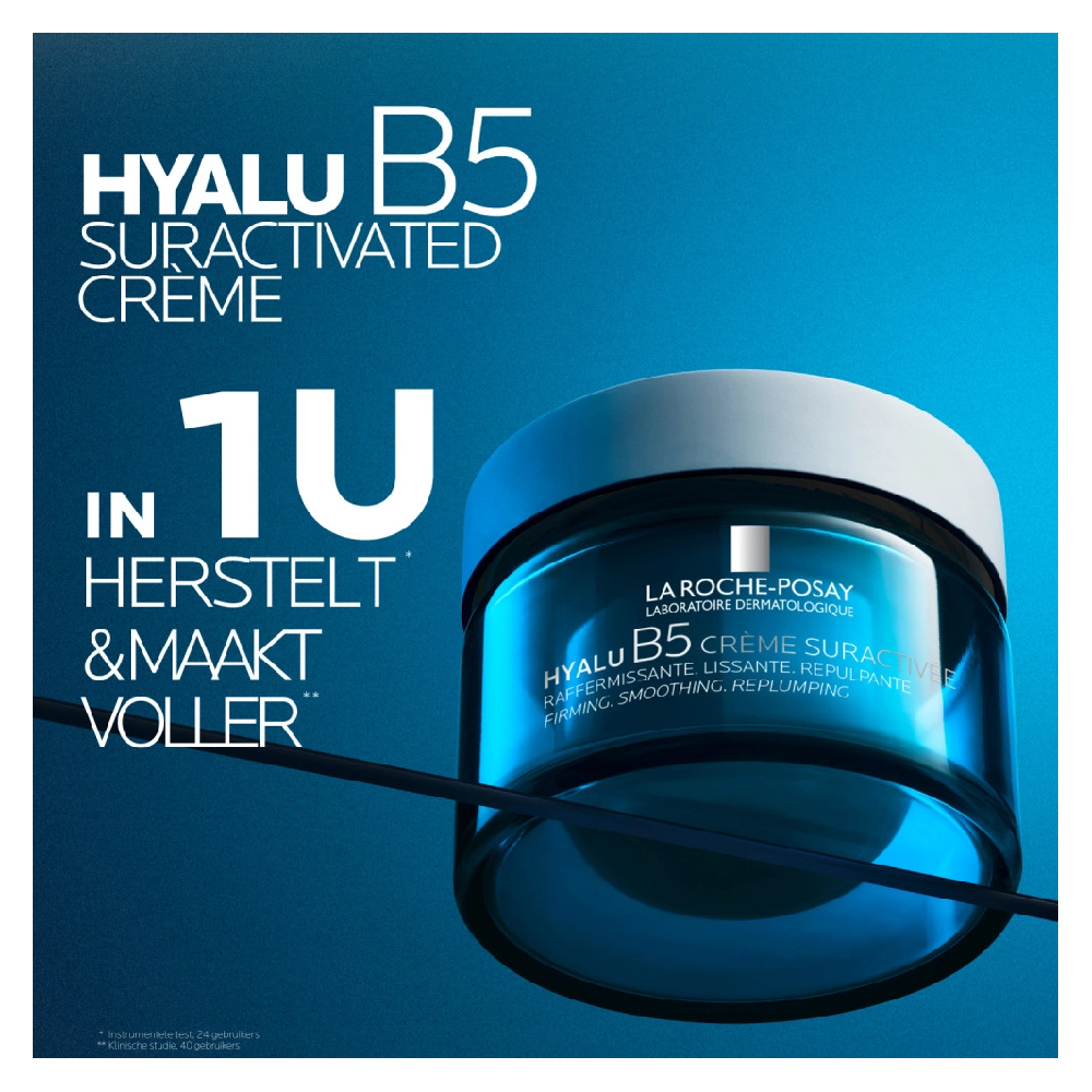 La Roche-Posay Hyalu B5 Suractivated Crème SPF 30 is een dagelijkse verstevigende anti-ageing crème die huidveroudering zoals rimpels vermindert en de huid beschermt tegen schadelijke UVB- en UVA-stralen. Deze innovatieve formule met SPF 30 helpt de huidbarrière al binnen 1 uur* te herstellen en biedt 72 uur intensieve hydratatie*. De formule met hyaluronzuur en vitamine B5 ondersteunt het herstel van de huidbarrière, helpt vocht vast te houden en maakt de huid voller, terwijl rimpels zichtbaar verminderen. De crème combineert deze effectieve anti-aging eigenschappen met zonbescherming, voor een gehydrateerde, stevigere en gezonder-uitziende huid. * Instrumentele test, 24 personen. La Roche-Posay Hyalu B5 Suractivated Crème SPF 30 is verrijkt met hyaluronzuur, bekend om zijn intens hydraterende werking. Het maakt de huidtextuur voller en zachter, terwijl het fijne lijntjes en rimpels zichtbaar vermindert. Vitamine B5 ondersteunt het herstel van de huidbarrière en versterkt de huid. De lichte, niet-plakkerige textuur biedt langdurig comfort en zorgt voor 72 uur* hydratatie. Deze hypoallergene, niet-comedogene formule is geschikt voor alle huidtypes, zelfs een gevoelige huid. Ideaal voor dagelijks gebruik, zowel 's ochtends als 's avonds, voor een gehydrateerde, soepelere en zichtbaar gezondere huid.