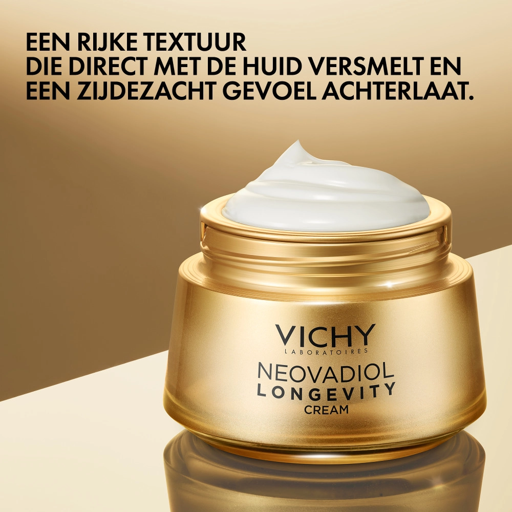 Vichy Neovadiol Longevity Dagcrème is een luxueuze, frisse gezichtscrème die speciaal is ontwikkeld voor een gevoelige, rijpere huid. Na een bepaalde leeftijd verliest de huid haar natuurlijke vermogen om zich te vernieuwen, waardoor ze minder stevig en volumineus oogt. Deze geavanceerde formule, verrijkt met de baanbrekende Longevisia Technologie, helpt het regeneratievermogen van je huidcellen te herstellen* en geeft je huid tot +42% meer volume**. Je gezicht krijgt weer definitie in 5 belangrijke zones: voorhoofd, oogcontour, wangen, mondhoeken en kaaklijn. Dankzij de krachtige combinatie van Proxylane, Niacinamide en Senevisium stimuleert Vichy Neovadiol Longevity Dagcrème de aanmaak van huidvezels***, voor een zichtbaar jeugdiger volume en een vollere, gladdere huid. Vanaf de eerste toepassing voelt je huid steviger, intens gevoed en zijdezacht aan. De rijke, niet-vette en niet-plakkerige textuur smelt direct samen met de huid en laat haar zacht en comfortabel aanvoelen, zonder vettigheid of plakkerigheid. Dermatologisch getest, hypoallergeen en perfect geschikt voor een gevoelige, rijpere huid. *In vitro-test op basis van actieve bestanddelen: Longevisia technologie. **Tot wel +42% volume op wangen. ***Resultaten verkregen op gereconstrueerde huid na 6 weken.Gebruik: Breng Neovadiol Longevity Dagcrème elke ochtend aan op een schone, droge huid. Masseer zachtjes in met opwaartse bewegingen tot de crème volledig is opgenomen. Gebruik deze praktische navulling om je flacon eenvoudig bij te vullen