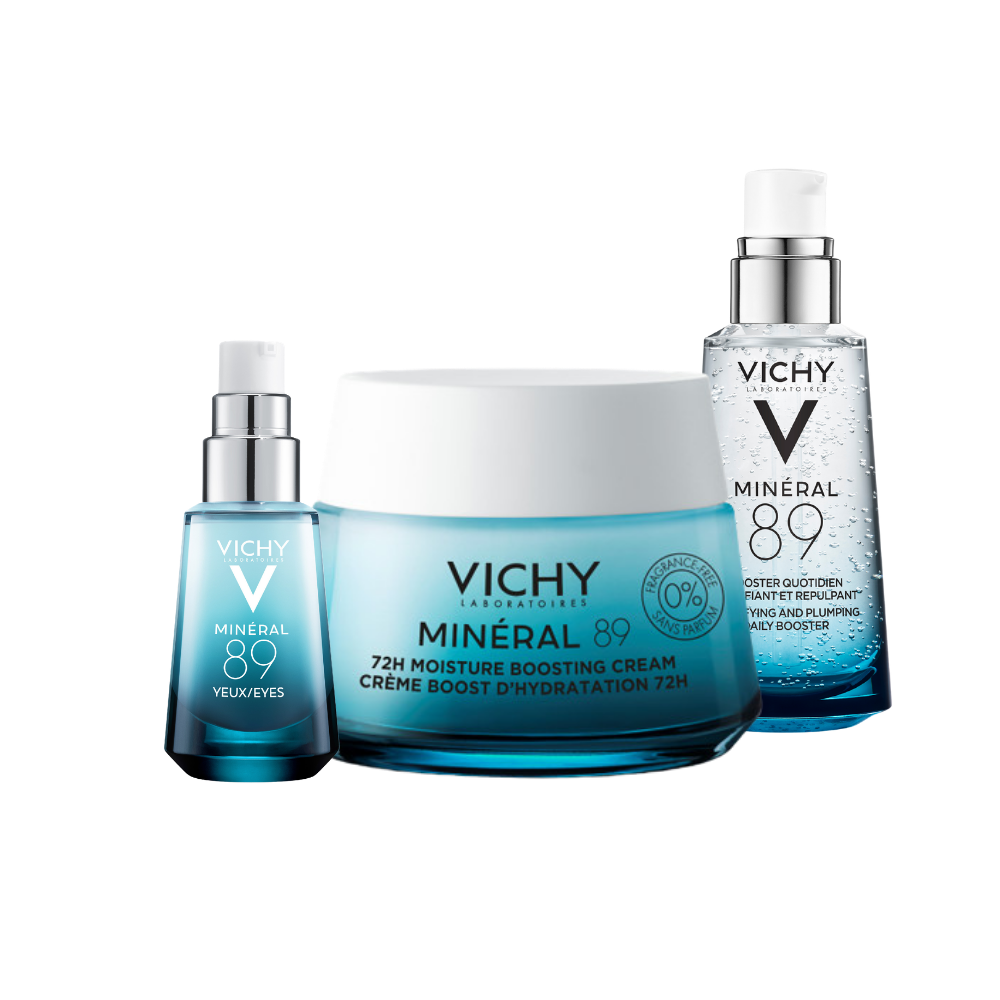 De routine set van Vichy Minéral 89 Hydratatie Boost. Met een serum, dagcrème en een oogcrème. De  Minéral 89 lijn van Vichy  versterkt de huid om haar dagelijks te beschermen tegen schadelijke invloeden van buitenaf.