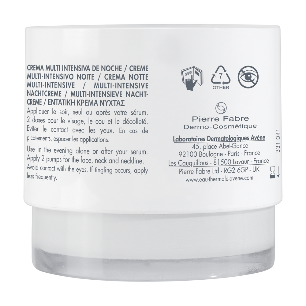 Multi-intensieve nachtcrème is een complete herstellende verzorging met 4 actieve bestanddelen: Retinal, niacinamide, hyaluronzuur, Haritaki. Deze herstellende nachtcrème stimuleert de aanmaak van cellen en verlengt hun levensduur *: dit bevordert langdurig het huideigen celvernieuwingsproces. Vanaf 15 dagen: de huid is bij het ontwaken gladder**. Na 15 dagen ziet de huid er steviger uit** Getest op alle huidtypes. Formule die voor 97% uit bestanddelen van natuurlijke oorsprong bestaat. *In-vitrotest met niacinamide. **Tevredenheidspercentage, 70 personen, eenmaal daags gebruik.