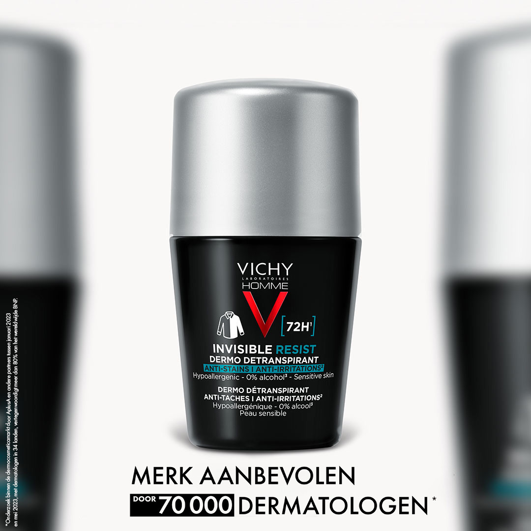 De Vichy Homme Invisible Resist 72h Anti-transpirant is speciaal ontwikkeld voor mannen. Hi j heeft een doeltreffende werking tegen vochtigheid en geurtjes en biedt optimale tolerantie dankzij zijn hypoallergene en alcoholvrije formule, getest op een gevoelige huid ter bescherming en tegen irritaties. Hij garandeert een hoge anti-transpiratiewerking gedurende maximaal 72 uur, met een langdurig parfum, zonder sporen achter te laten. De Invisi-Lock-technologie, goedgekeurd door het IFTH (Institut Français du Textile et de l’Habillement), zorgt ervoor dat er geen gele vlekken op licht textiel of witte vlekken op donker textiel verschijnen en voorkomt dat het deodorant resten achterlaat die kleding kunnen doen verstijven. De niet-vette en niet-plakkerige textuur maakt deodorant aangenaam om te dragen. De voordelen van de unieke en klinisch bewezen geavanceerde technologie zijn goedgekeurd door 90% van de gebruikers , die van mening zijn dat deze dermo-transpirant doeltreffend is tegen slechte en vochtigheid.