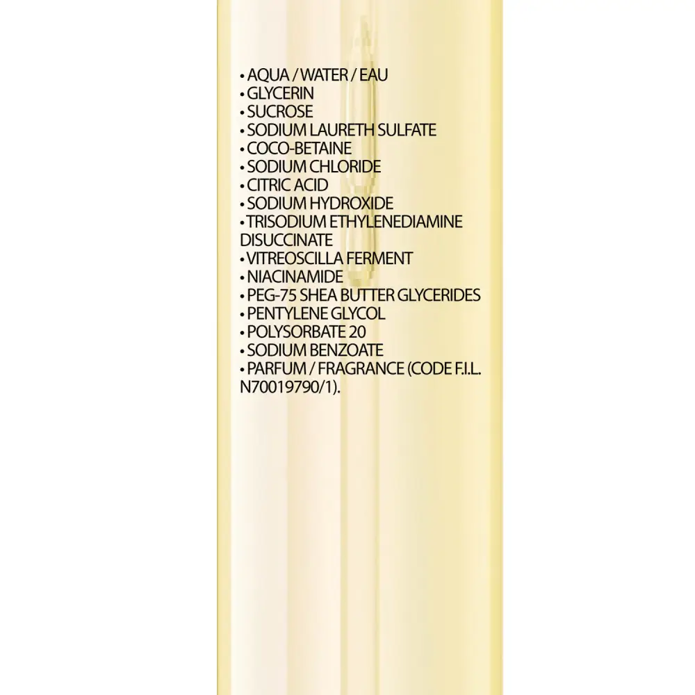 AQUA /WATER • GLYCERIN • SUCROSE • SODIUM LAURETH SULFATE • COCO-BETAINE • SODIUM CHLORIDE • CITRIC ACID • NIACINAMIDE • PARFUM / FRAGRANCE • PEG-75 SHEA BUTTER GLYCERIDES • POLYSORBATE 20 • PPG-5-CETETH-20 • SODIUMBENZOATE • SODIUM HYDROXIDE • VITREOSCILLA FERMENT